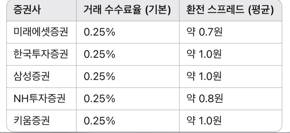 2025년 5월 기준, 주요 증권사의 미국 주식 거래 수수료율과 환전 스프레드는 다음과 같습니다.